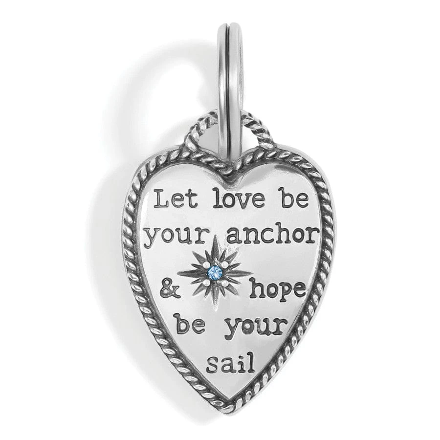 A heart with blue crystals and anchor adds a charming nautical touch to your carrier. It is inscribed on the back with “Let love be your anchor & hope be your sail.”