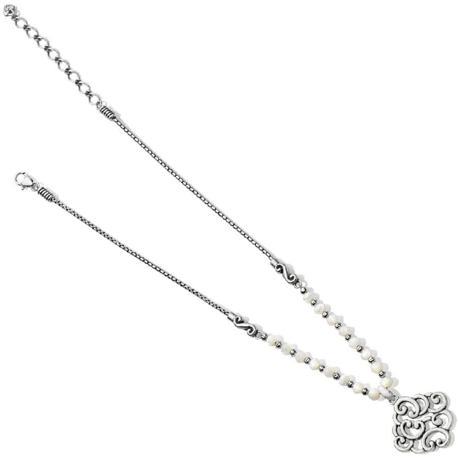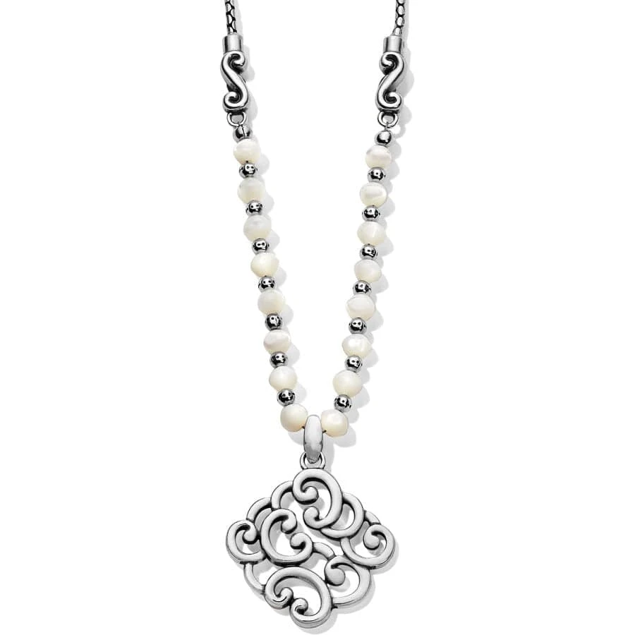 Mother of Pearl beads in classic white lend a lightness to this short necklace featuring a diamond-shaped pendant comprised of softly sculpted scrolls.