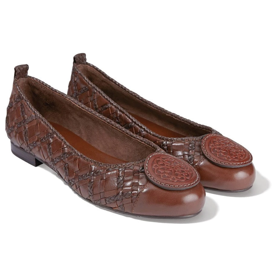 So rich in detail, this ballerina shoe features braided strips interwoven with hand stained flat strips and a handcrafted leather Ferrara medallion. A graceful finishing touch!