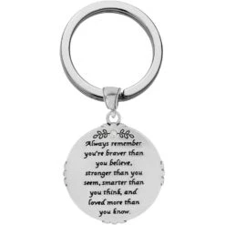 Carry a brave angel with you wherever you go on this medallion key chain. On its back, it inspires with the message: Always remember, you are braver than you believe, stronger than you seem, smarter than you think and loved more than you know.