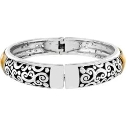 Curved bars of smooth black enamel are flanked by feminine scrolls on this hinged bangle. Its oval shape lends comfort and ease of wear.