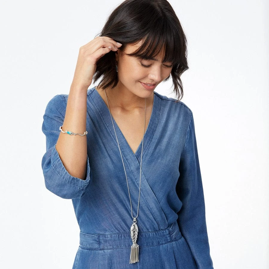 This sleek, shimmering fish silhouette is fully articulated with movable links. Its tail transitions into an elegant tassel made up of multiple strands of serpentine chain, giving the appearance that it is moving through the ocean. This contemporary two-tone fish features a little wiggling tail, lending a playfulness to your look.