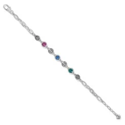 “Pointillism” is the technique of small, distinct dots of color, applied in patterns to form an image. This bracelet with translucent crystals in amethyst, aquamarine, emerald and sapphire, along with pierced silver scrolls, are dots that blend together to create a harmony of color and form.