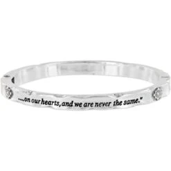 Inspirational words and small crystal highlights make this bangle both meaningful and fashionable. Etched saying “Some people come into our lives, leave footprints on our hearts, and we are never the same.”
