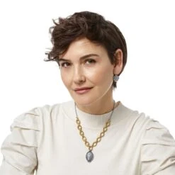 Inspired by the sun, this pendant on a cool chain link has a hand-set glass that is handcrafted in Germany and encased in clear gloss for luminosity.