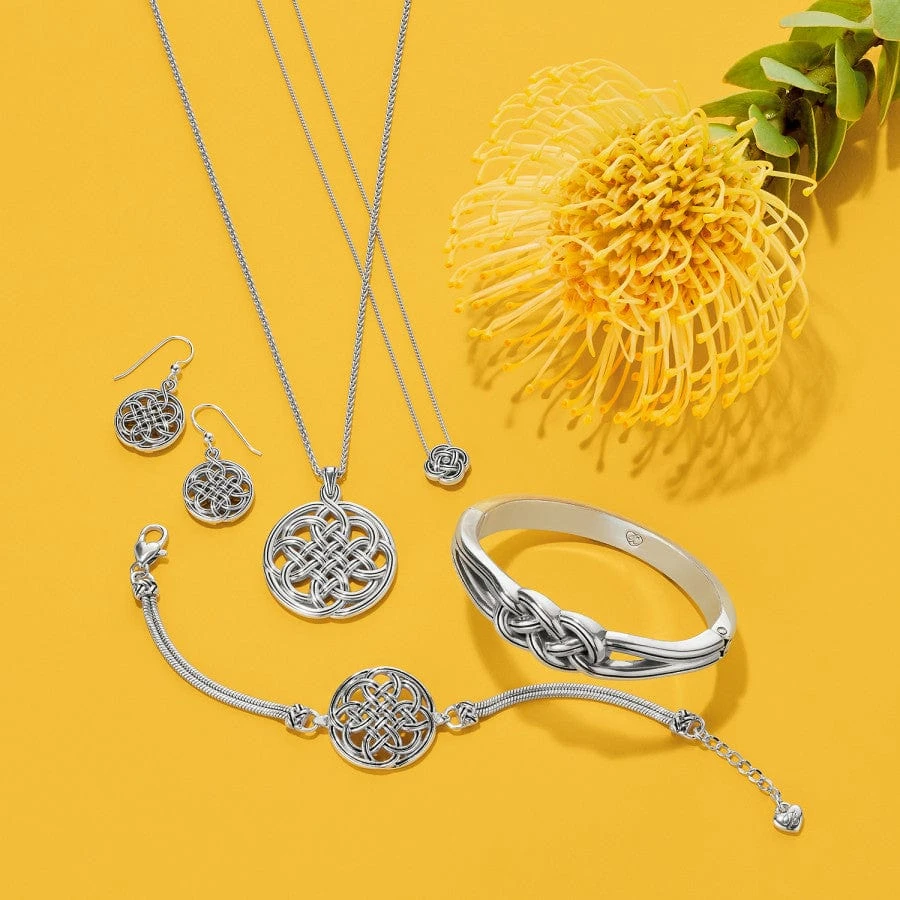 The French wire earrings are a petite version of the necklace – woven in a macramé pattern that beautifully reinterprets the art of the Celtic knot.