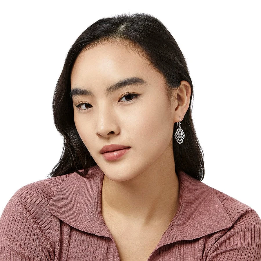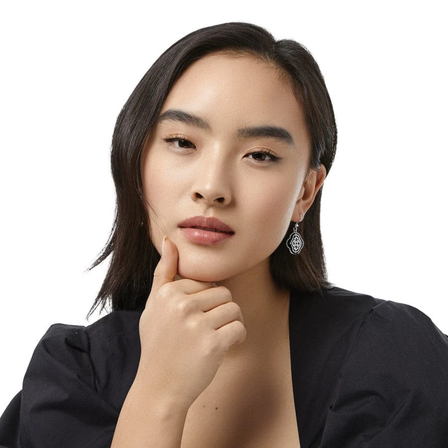 A beautiful pierced silver design is the central focal point in these teardrop silhouettes, inlaid with perfect precision.