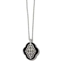 The iconic silver pierced design is outlined in an almost-arabesque silhouette and finished with four tiny crystals on four corners. The pendant is reversible from gold with silver to black enamel