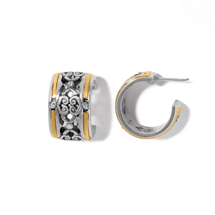 A decorative silver pierced design repeats in the center and is encased by a gold or black band on either side. These special hoops are a huggie style that’s easy to wear every day.