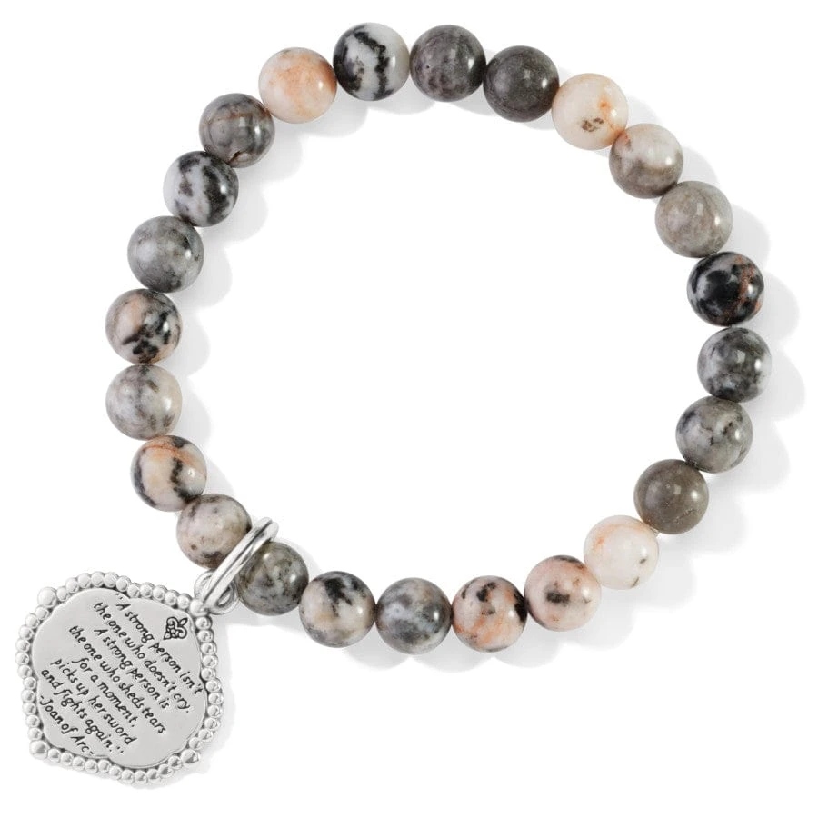 Celebrate inner strength and strong women of faith (like Joan of Arc) while wearing this stretch bracelet with multi-hued jasper beads.
