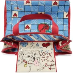 Every part of this tote created by designer Tom Clancy features his hand-drawn artwork, including the inside pocket with his own pup, Chip, and a playful kitten on the bottom. He was inspired by a vintage quilt to create this beautiful, large tote. The bow makes it like a present to yourself – or someone you love!