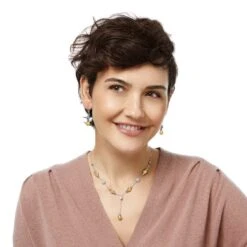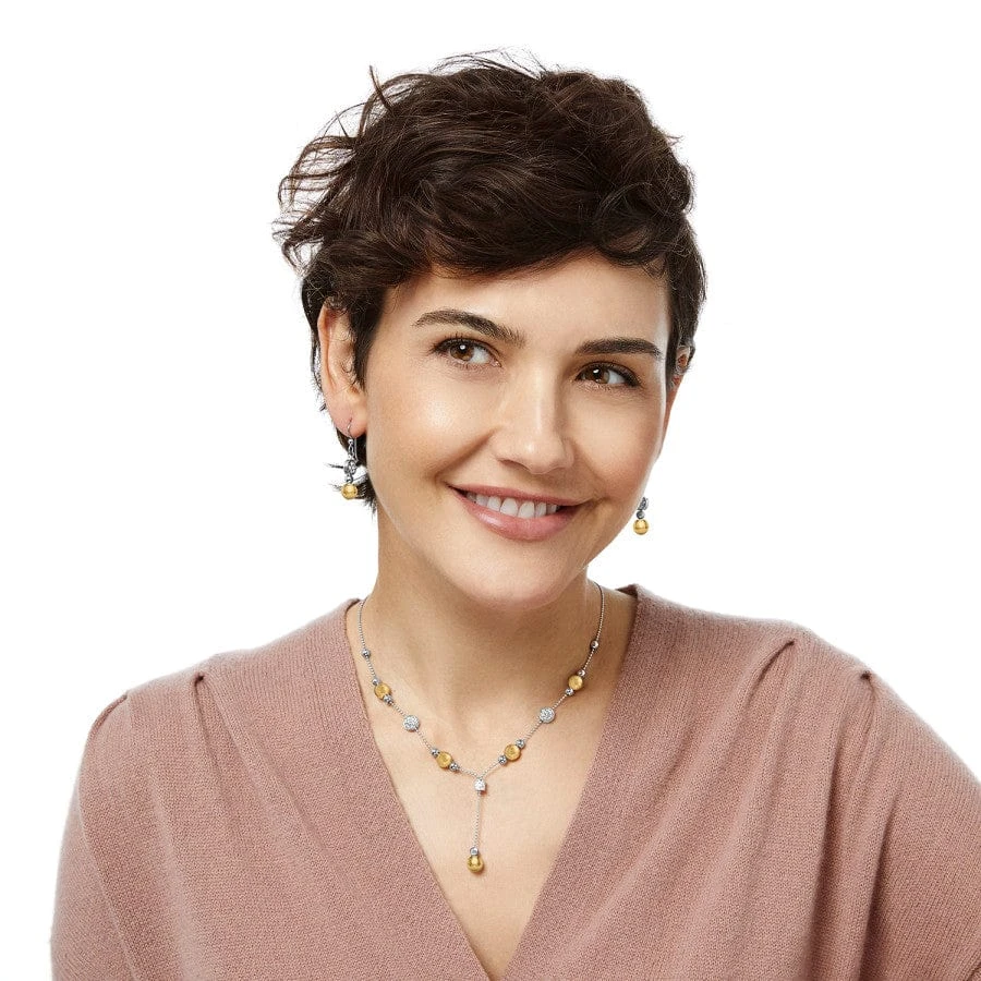 Shiny gold polished balls and silver stations dusted with hand-set pave crystals enhance this Y-silhouette necklace that is perfect to layer or wear on its own.