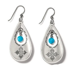 Inspired by patterns in Mexican Talavera tile, these etched statement earrings have faceted coin shaped turquoise beads for swingy movement. They’re surprisingly lightweight!
