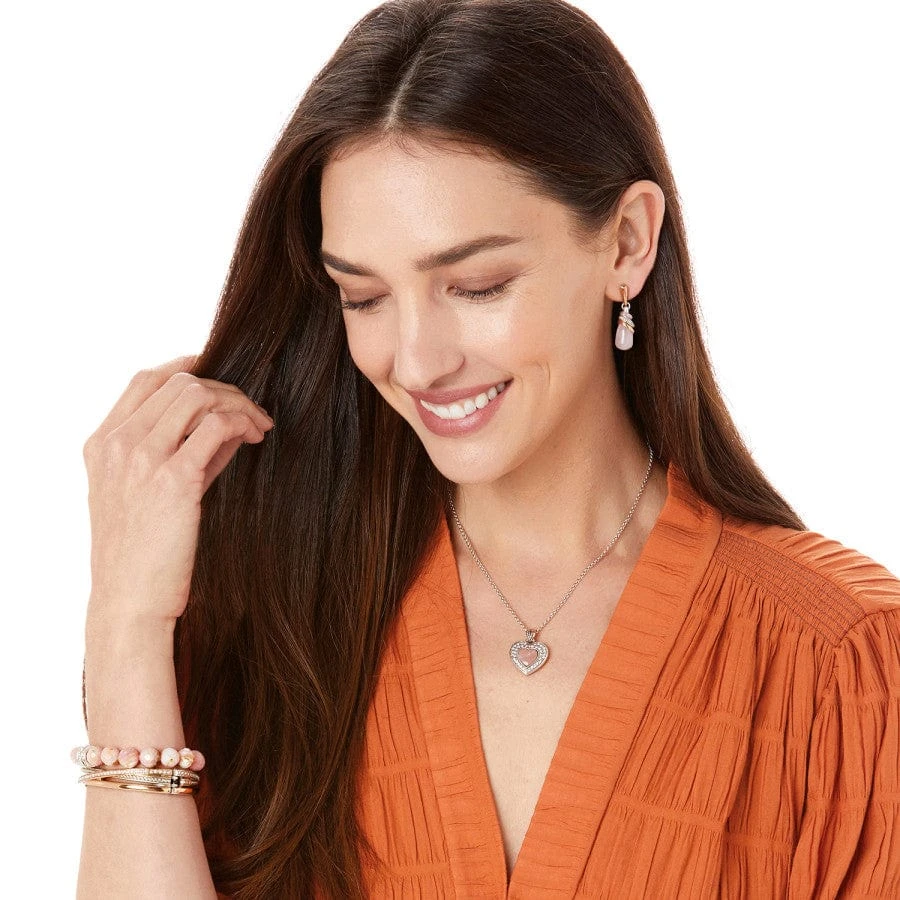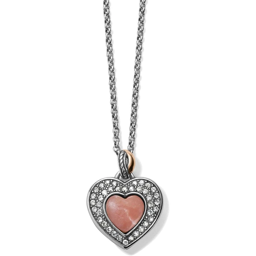 This reversible heart necklace features Pink Opal on one side, showcased in a framework of pave fine quality crystal, while the other offers rose gold plating, surrounded by smooth silver. Pink opal is said to promote spiritual awakening and renewal.
