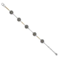 Inspired by the mystique of Neptune, this delicate silver and gold station bracelet uses the familiar two-tone “rings” to create a pillow shaped “woven” design. Fine crystals adorn the perimeter of each piece imbuing a classic refined quality.