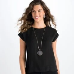 On one side, this pendant has an “embroidered” star that features more than 360 hand-set fine quality crystals. On the other, a filigree pattern of delicate beauty. Wear long or short.