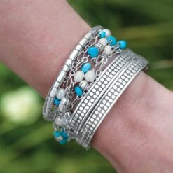 Our designer mixed turquoise magnesite beads and freshwater rice pearls with her Balinese-inspired pebble mosaics for a stunning design you can wear four ways: as a Y necklace, long, doubled as a shorter layered necklace and as a bracelet.