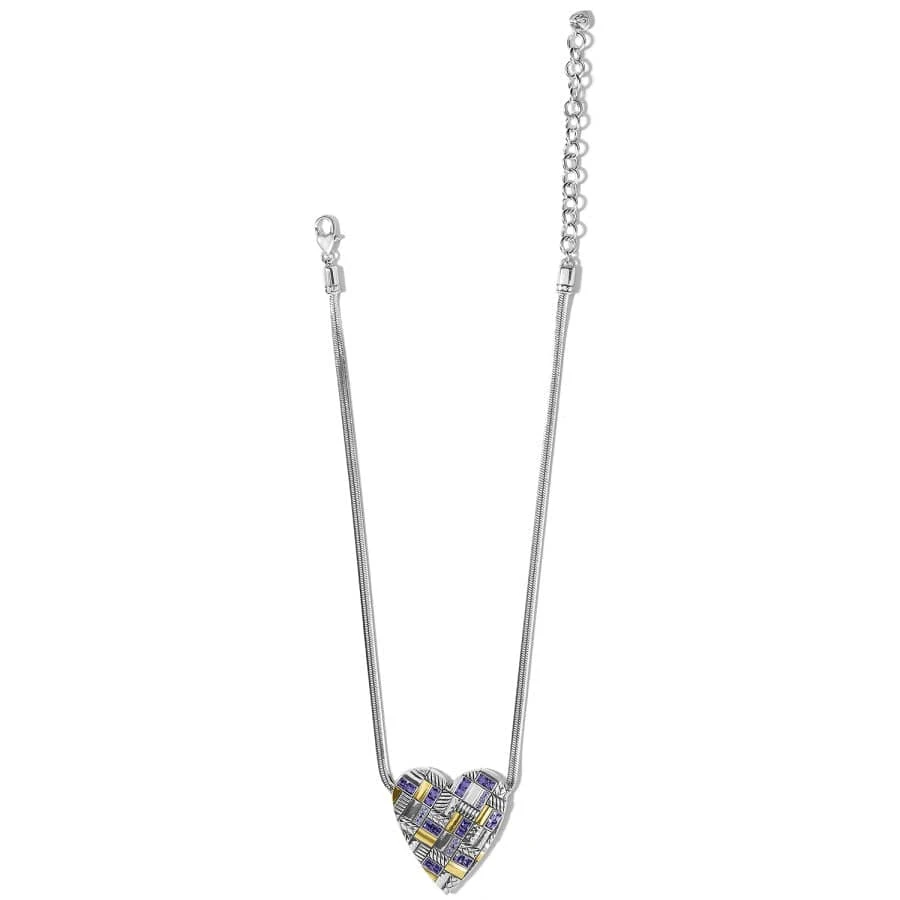 Two-tone tapestries – smooth, braided and swirled – are overlaid with jewel-toned crystal baguettes enhancing the geometry of this heart design.